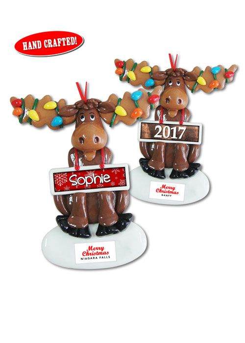 Trim your Christmas tree with a personalized handcrafted poly resin Holiday Moose ornament!